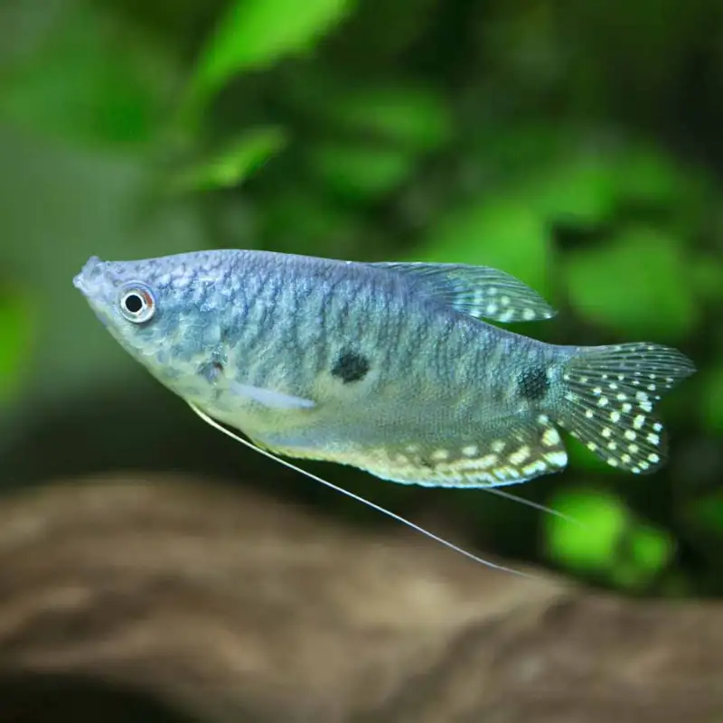 The Blue Gourami (Trichopodus trichopterus) is a hardy and popular freshwater fish native to Southeast Asia. It is easily recognized by its whitish-blue body and two distinct black spots on its side (which, combined with the eye, gives it the nickname “Three-Spot Gourami”). Like all gouramis, it possesses long, thread-like “feelers” that it uses to touch its surroundings and a special organ that allows it to breathe air from the water’s surface. Now in stock