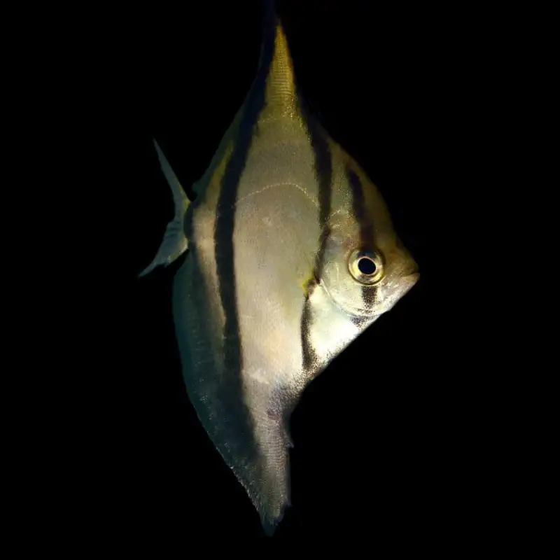 Coloration: The body is primarily a shimmering silver. It features three distinct dark black bands: one running through the eye, a second just behind the gill cover, and a third curving from the tip of the dorsal fin down to the anal fin.