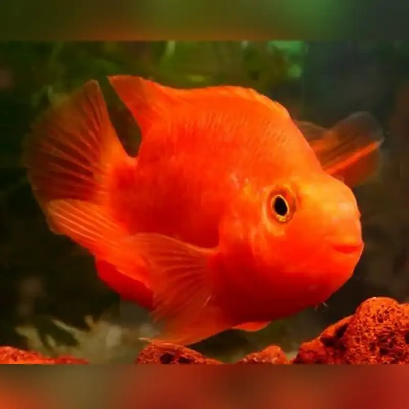 The Red Parrot Cichlid is a freshwater hybrid fish first developed in Taiwan in the 1980s. It is recognized by its round, balloon-like body, bright orange or red coloration, and a small, beak-like mouth that cannot fully close. Growing to about 20 cm (8 inches), they are intelligent, inquisitive “water puppies” that will often recognize their owners. While they can be territorial, their small mouths make them less dangerous than other cichlids, making them great for community tanks with medium-sized fish. Now in stock